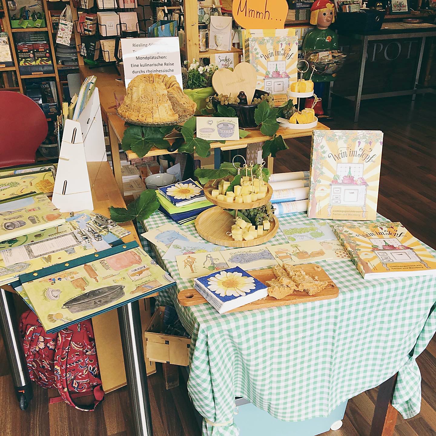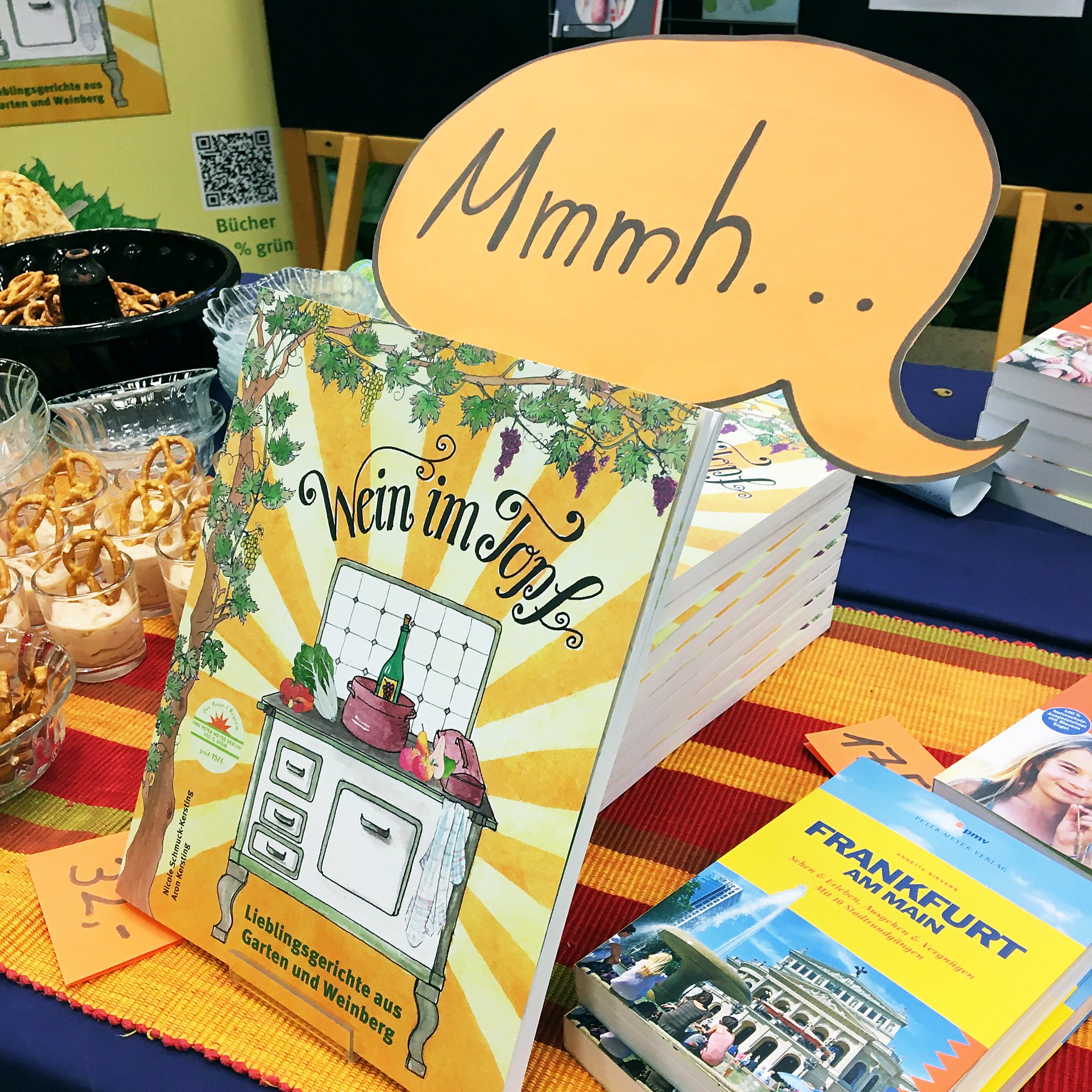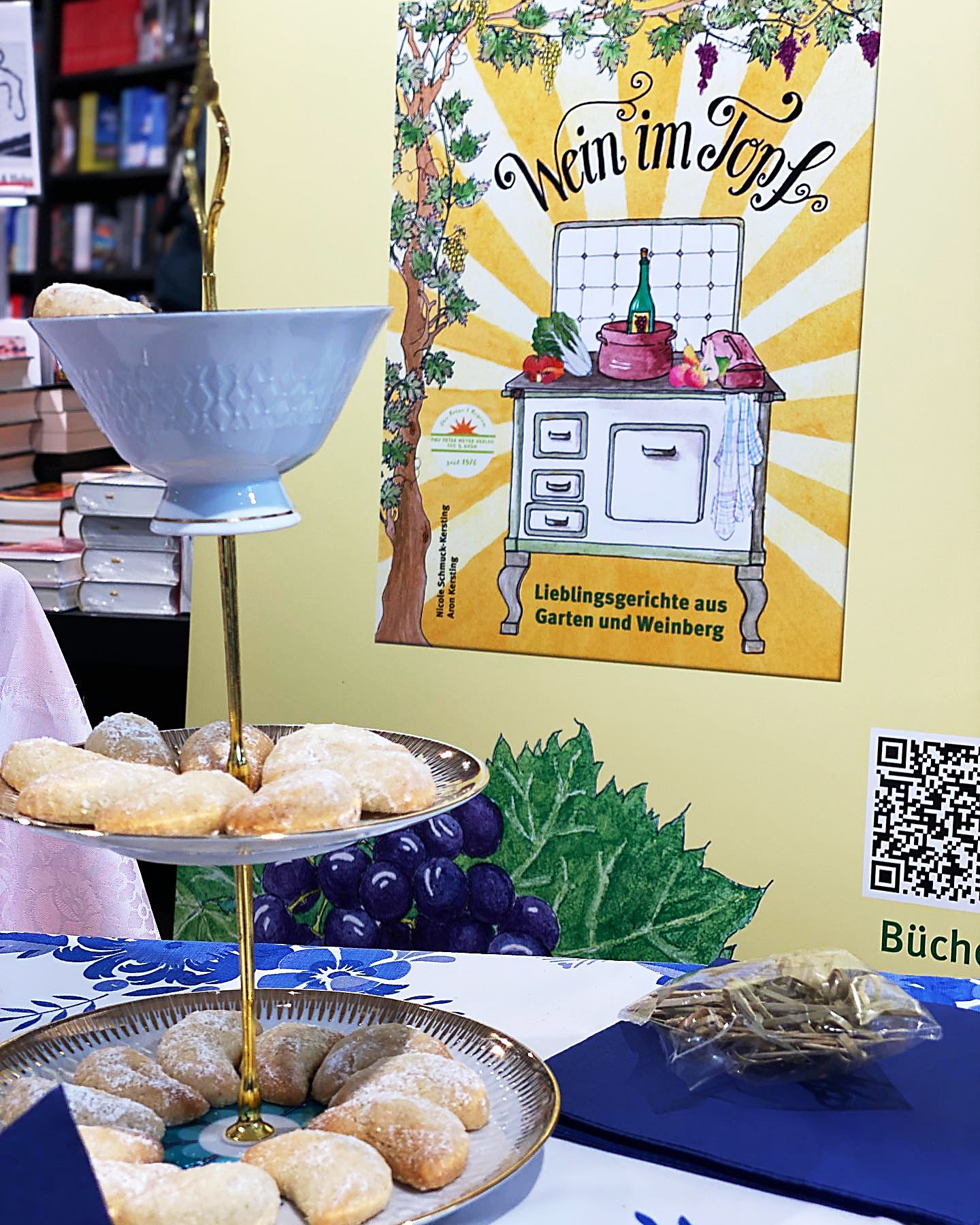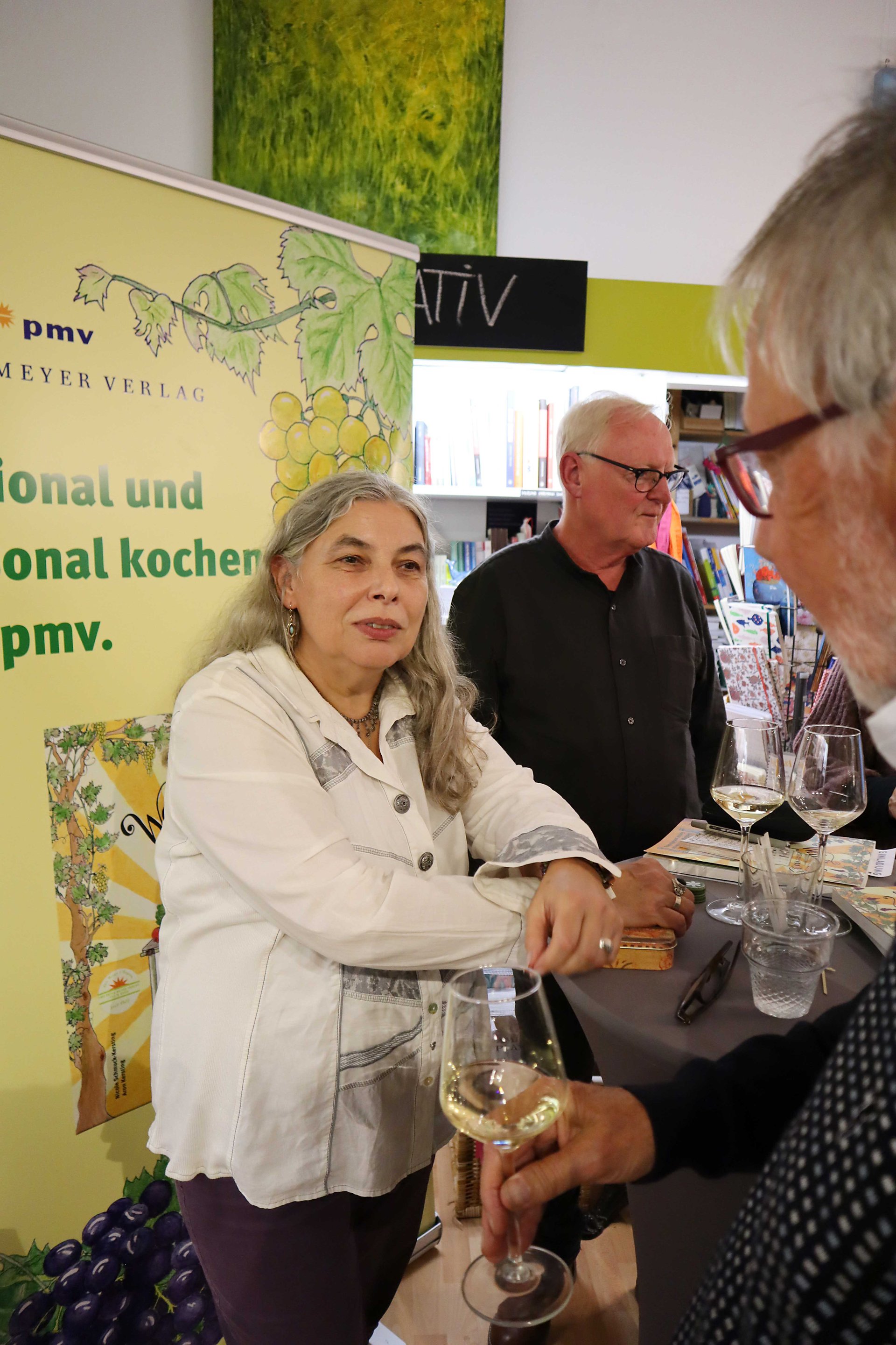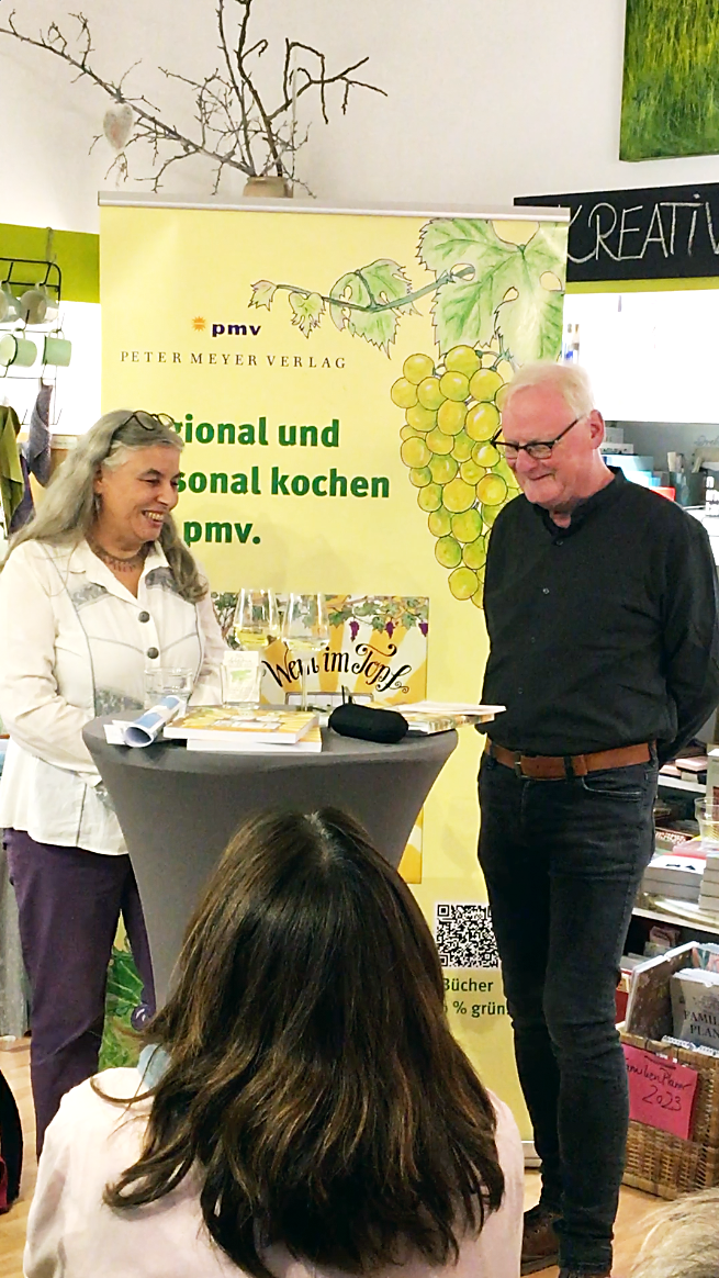 Künstlerin und Verlegerin sind stolz auf ihr neues Kochbuch. Zur Präsentation gab es anregende Gespräche sowie einen selbstgebackenen Riesling-Bund (aus Wein im Topf).